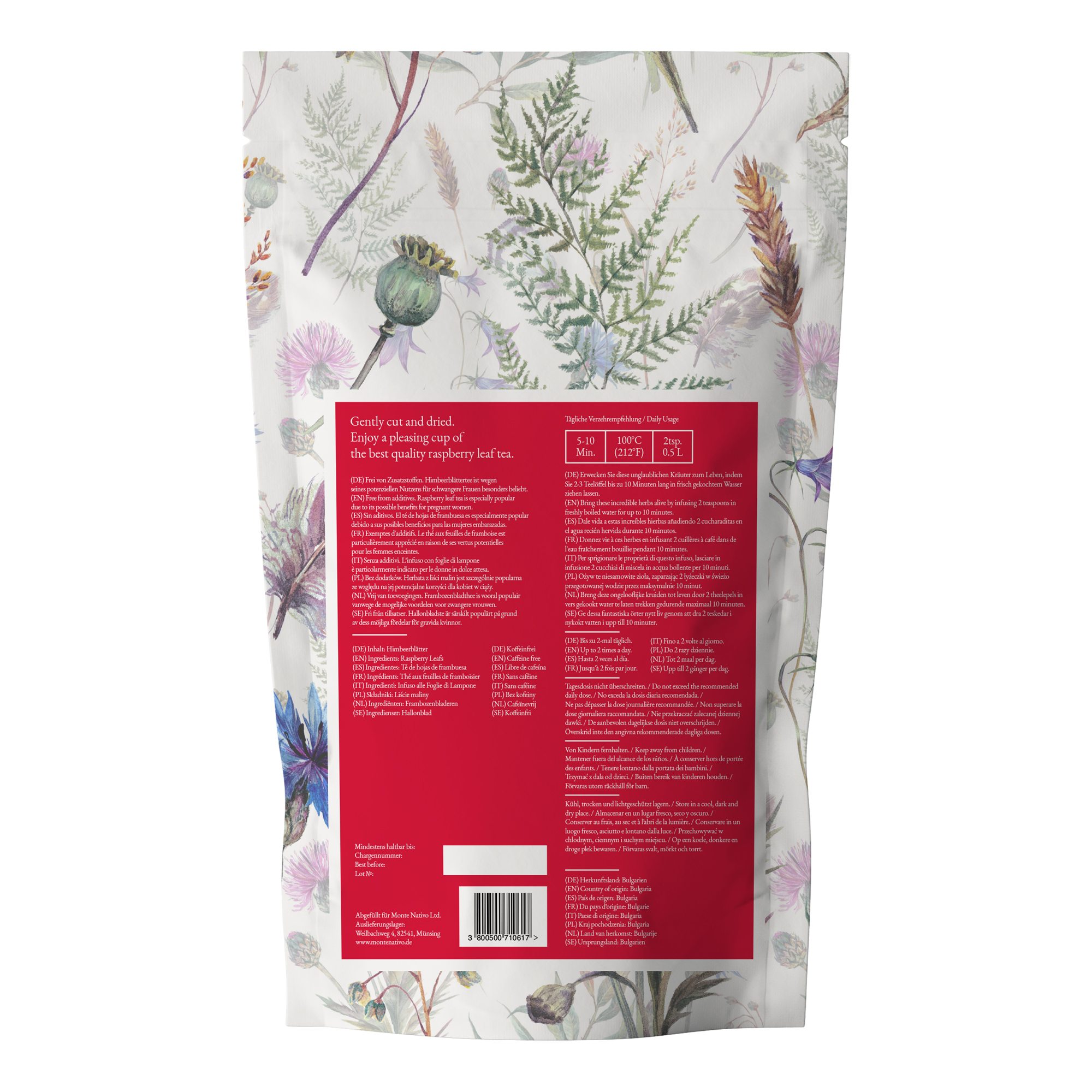 Die Monte Nativo Himbeerblätter werden schonend sonnengetrocknet und stammen aus kontrolliertem Anbau in Bulgarien.