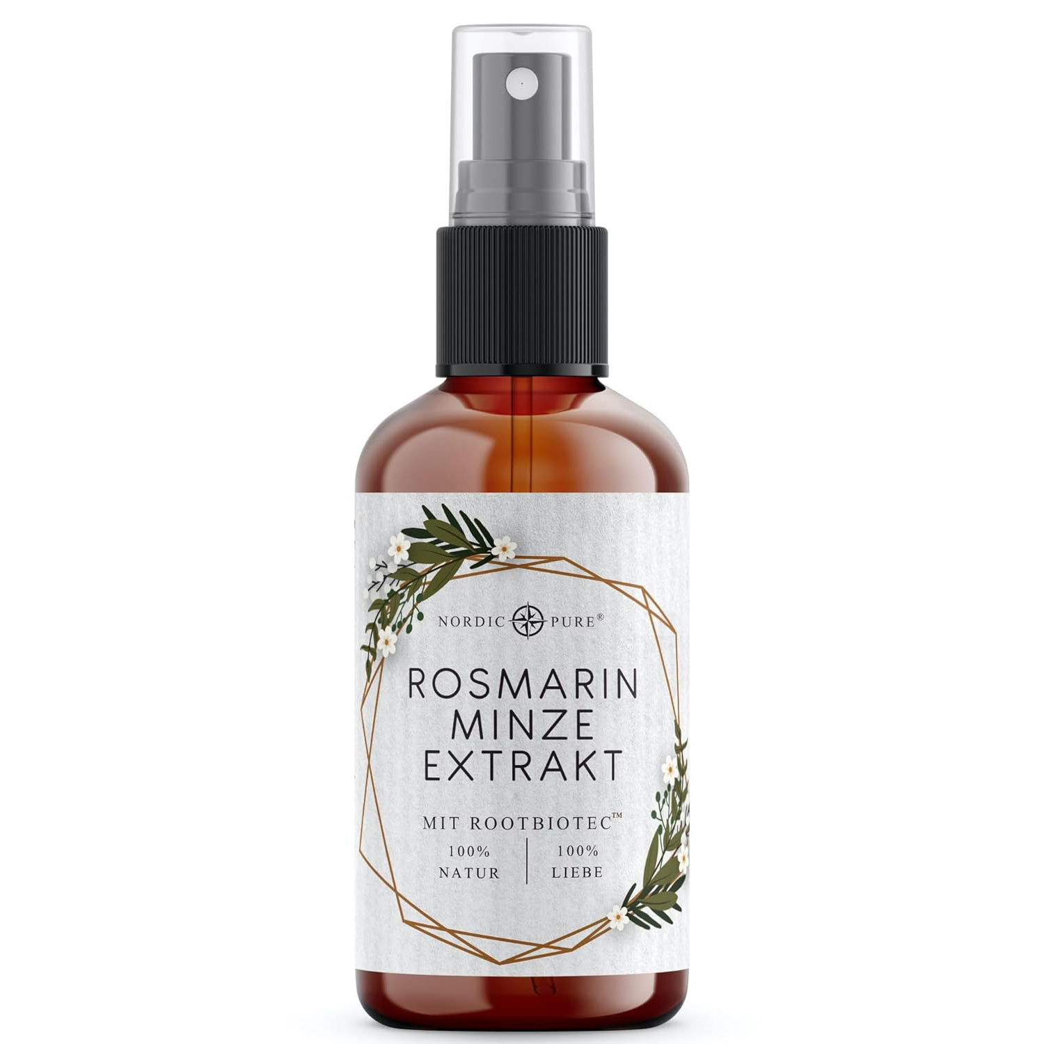 Das Rosmarin‑Minze‑Extrakt von Nordic Pure bietet hier eine natürliche Alternative: Die alkoholfreie, ölfreie Formulierung kombiniert Rosmarinwasser, Minzextrakt und RootBioTec™ in einer leichten Textur, die weder fettet noch austrocknet. Schon wenige Sprühstöße lassen sich unkompliziert einmassieren und schenken Kopfhaut und Haar ein angenehm belebendes Gefühl.