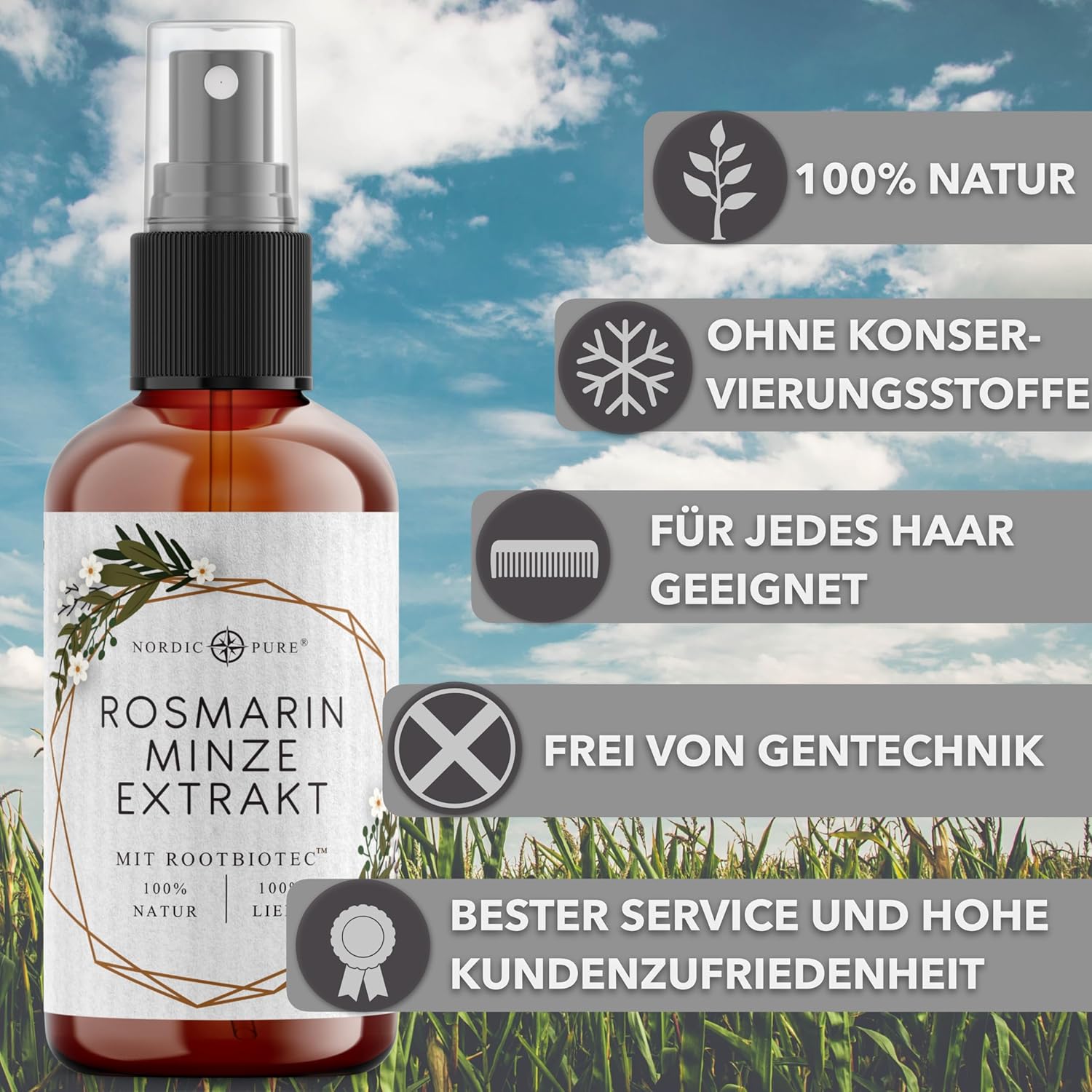 Das Rosmarin‑Minze‑Extrakt von Nordic Pure bietet hier eine natürliche Alternative: Die alkoholfreie, ölfreie Formulierung kombiniert Rosmarinwasser, Minzextrakt und RootBioTec™ in einer leichten Textur, die weder fettet noch austrocknet. Schon wenige Sprühstöße lassen sich unkompliziert einmassieren und schenken Kopfhaut und Haar ein angenehm belebendes Gefühl.