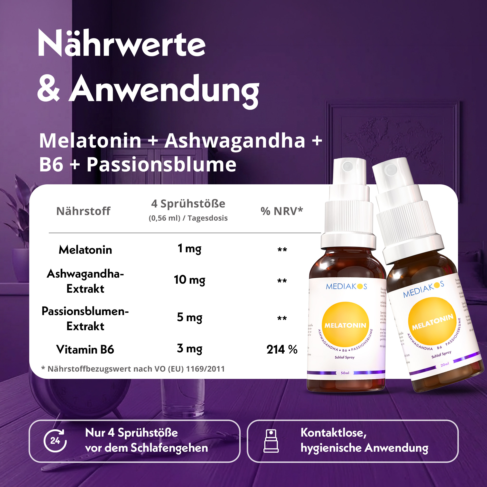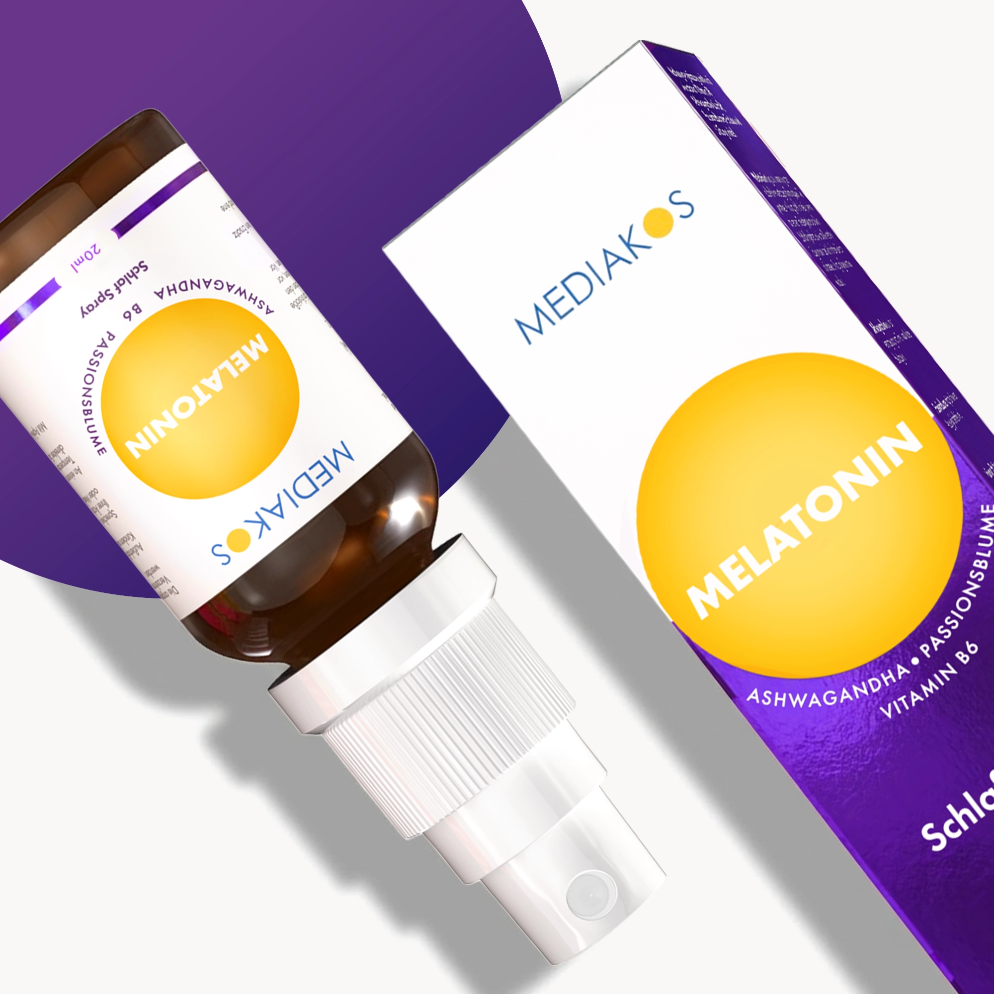Unser Mediakos Melatonin + Ashwagandha Schlaf Spray wurde sorgfältig entwickelt, um Dir zu helfen, am Abend zur Ruhe zu kommen und einen erholsamen Schlaf zu genießen. Es enthält eine einzigartige Kombination aus hochwertigem Melatonin und Ashwagandha, Passionsblume und Vitamin B6.