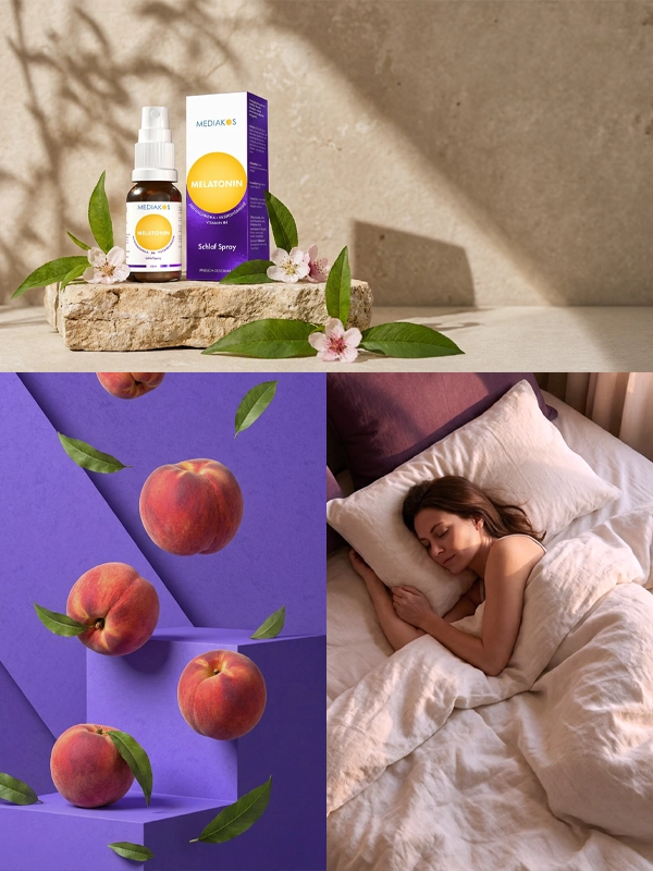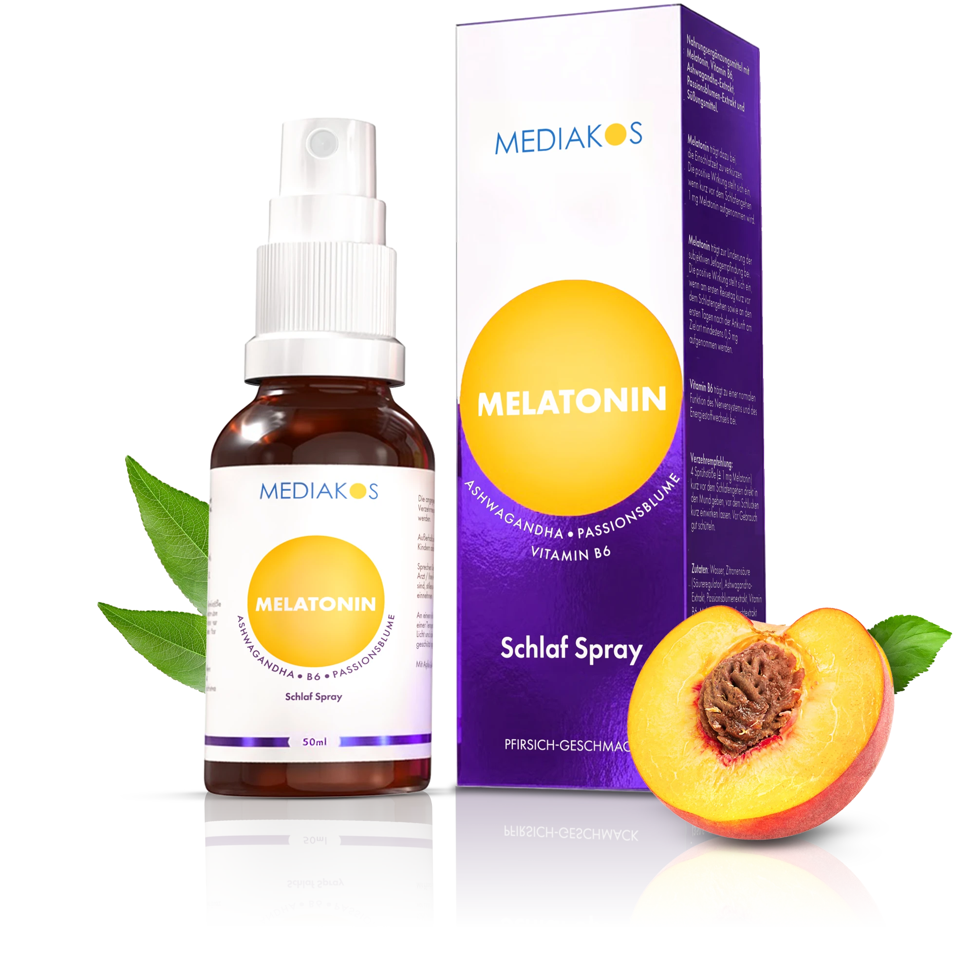 Das Melatonin + Ashwagandha Mediakos Schlaf Spray hat ein natürliches Pfirsich-Aroma.