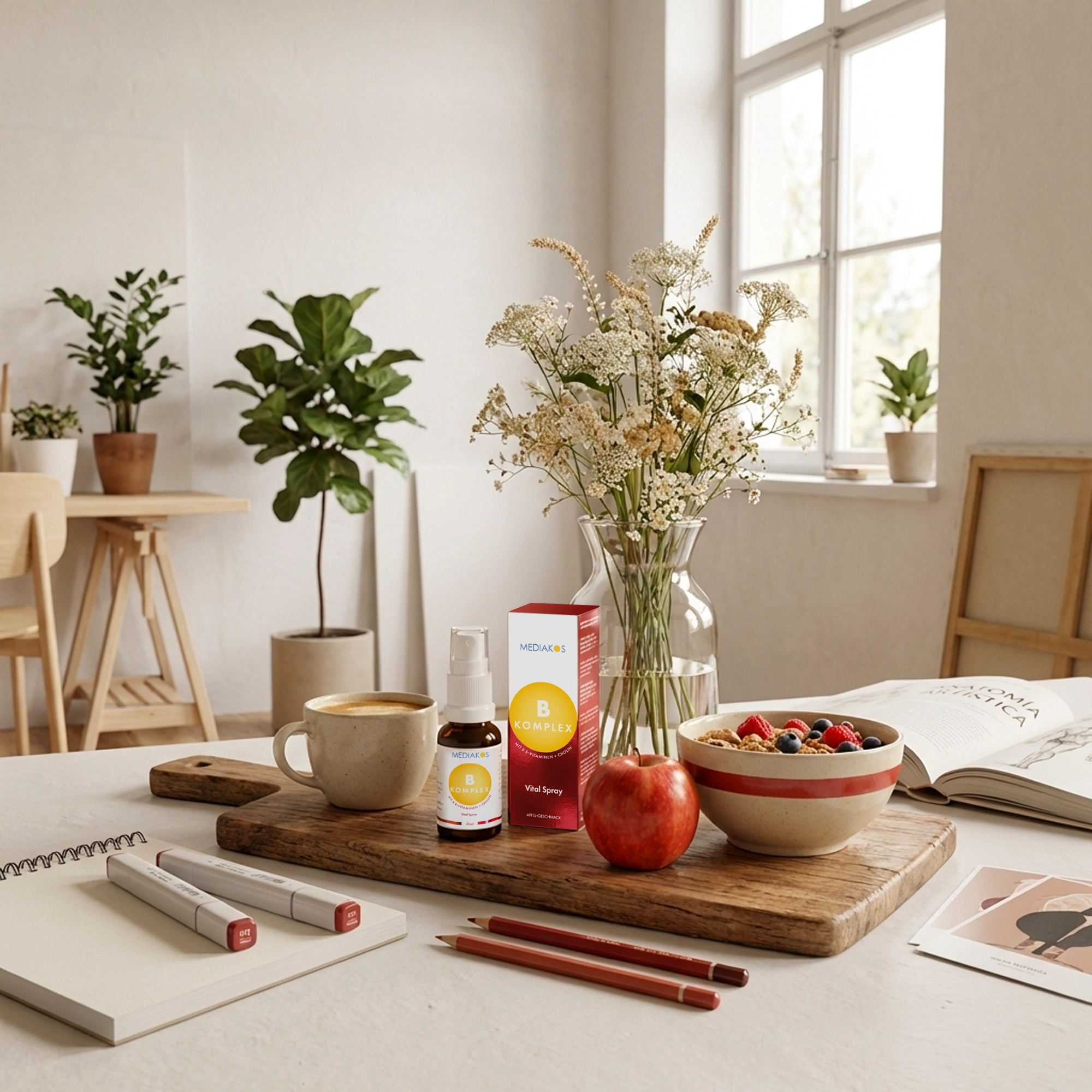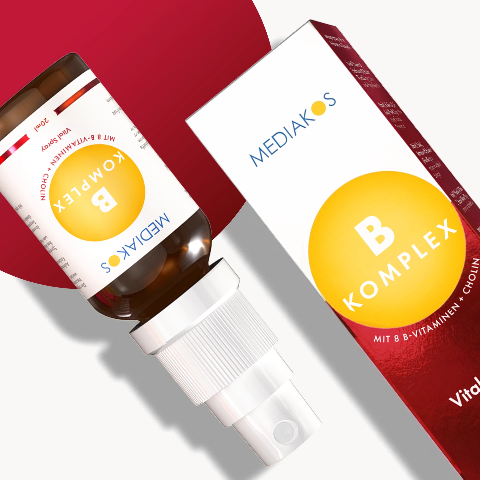 Unser Mediakos Vitamin B Komplex Vital Spray vereint alle 8 B-Vitamine plus Cholin-Bitartrat in einer praktischen Formel – so musst Du Dir keine Gedanken darüber machen, welches B-Vitamin Du gerade brauchst.