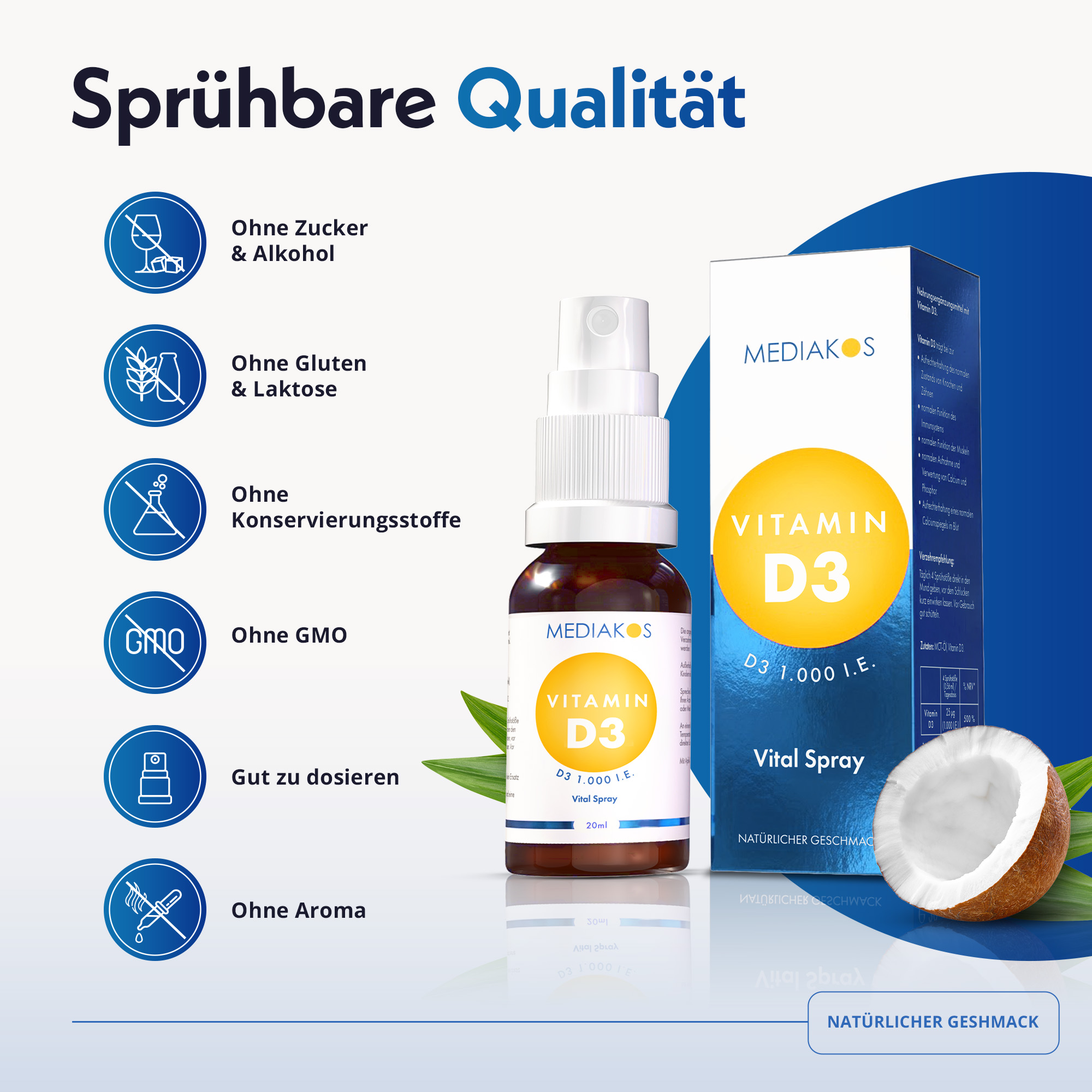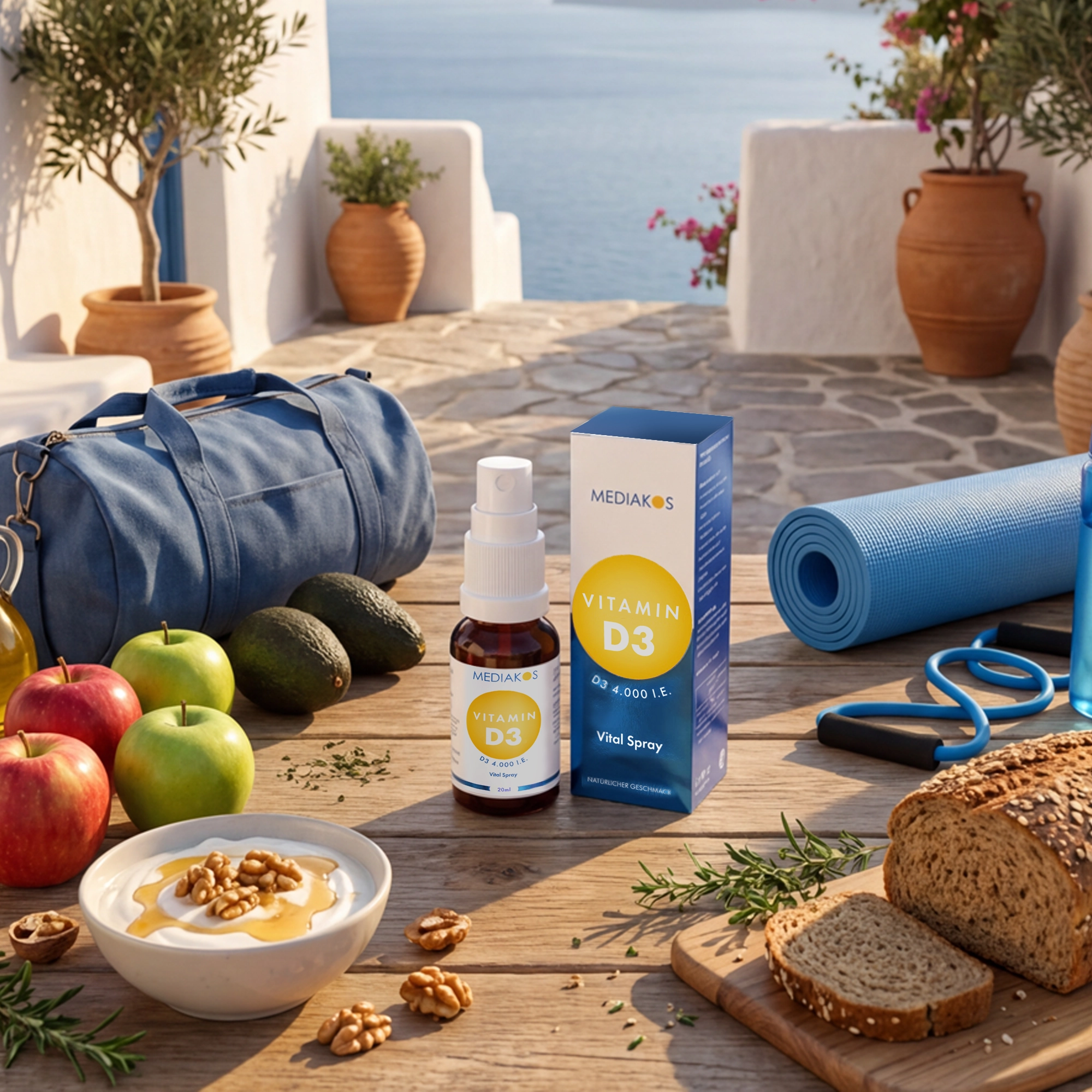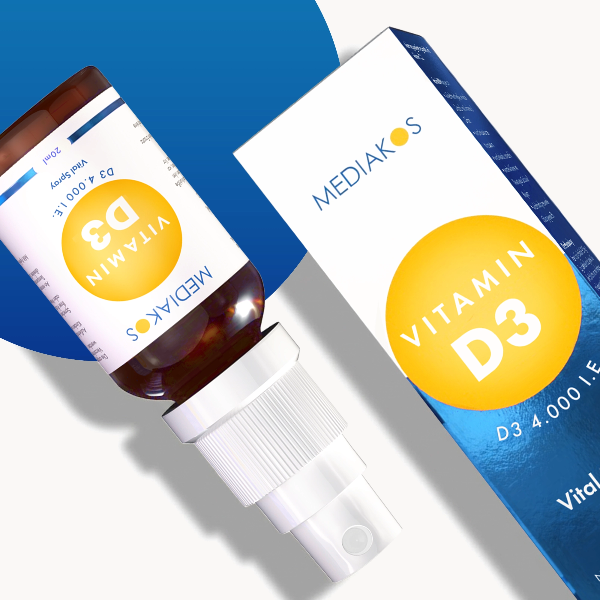 Das Mediakos Vitamin D3 Vital Spray ist ein Nahrungsergänzungsmittel mit Cholecalciferol – der natürlichen Form von Vitamin D3 – gelöst in MCT-Öl aus Kokos. Es ist in zwei Dosierungen erhältlich: 1.000 I.E. und 4.000 I.E. Erhältlich als 20 ml Flasche.