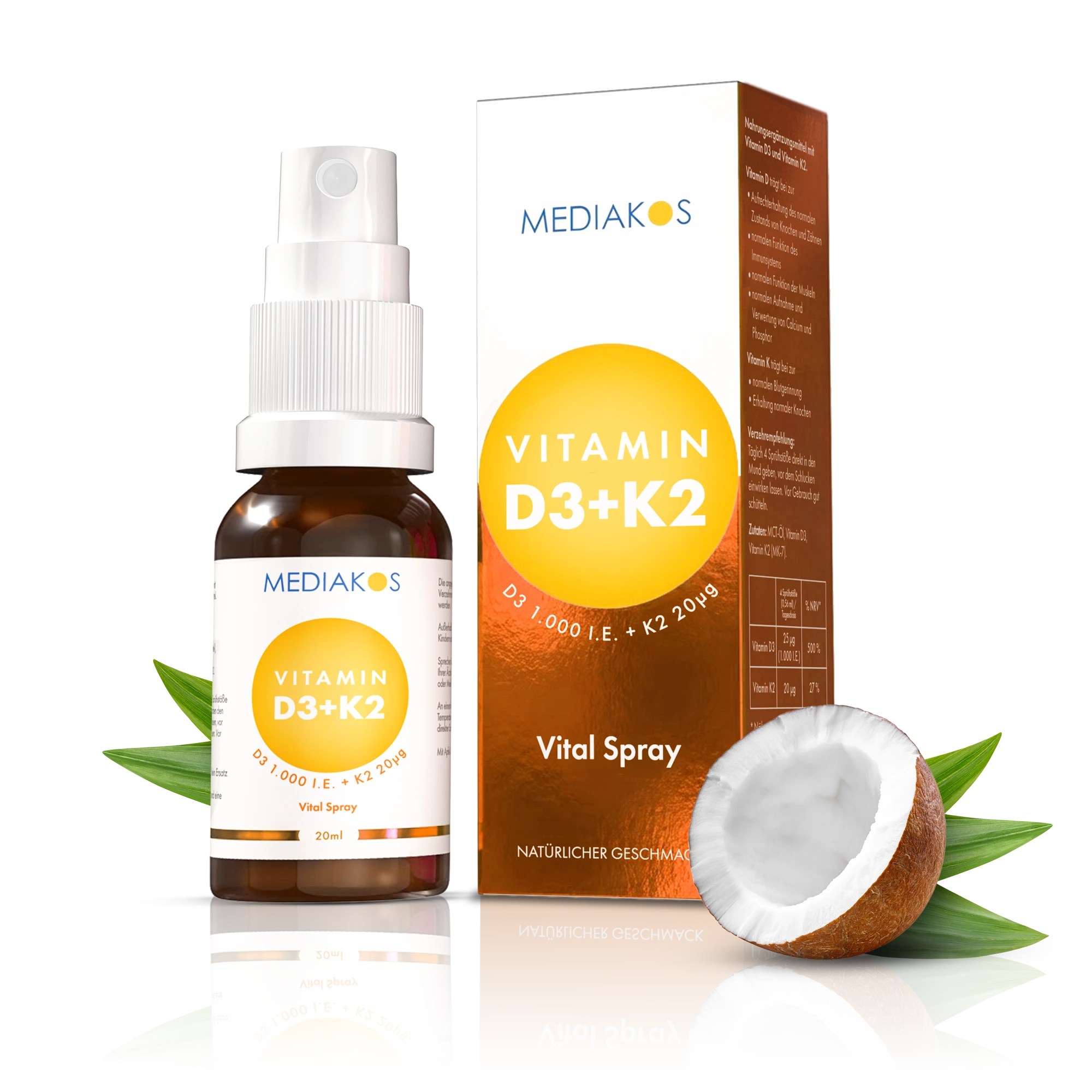 Das Mediakos Vitamin D3 + K2 Vital Spray ist ein Nahrungsergänzungsmittel, das Vitamin D3 als Cholecalciferol und Vitamin K2 als MK-7 in einem praktischen Mundspray vereint. Es ist in zwei Dosierungen erhältlich: 1.000 I.E. + 20 µg und 4.000 I.E. + 60 µg. Beide Vitamine sind in MCT-Öl aus Kokos gelöst – dem idealen Träger für fettlösliche Vitamine.